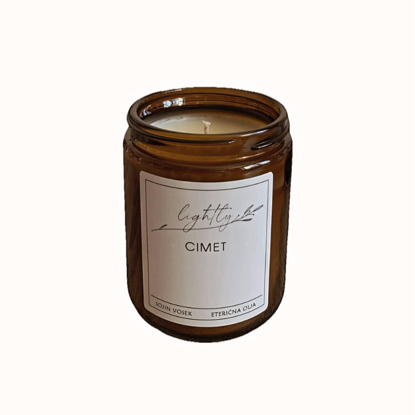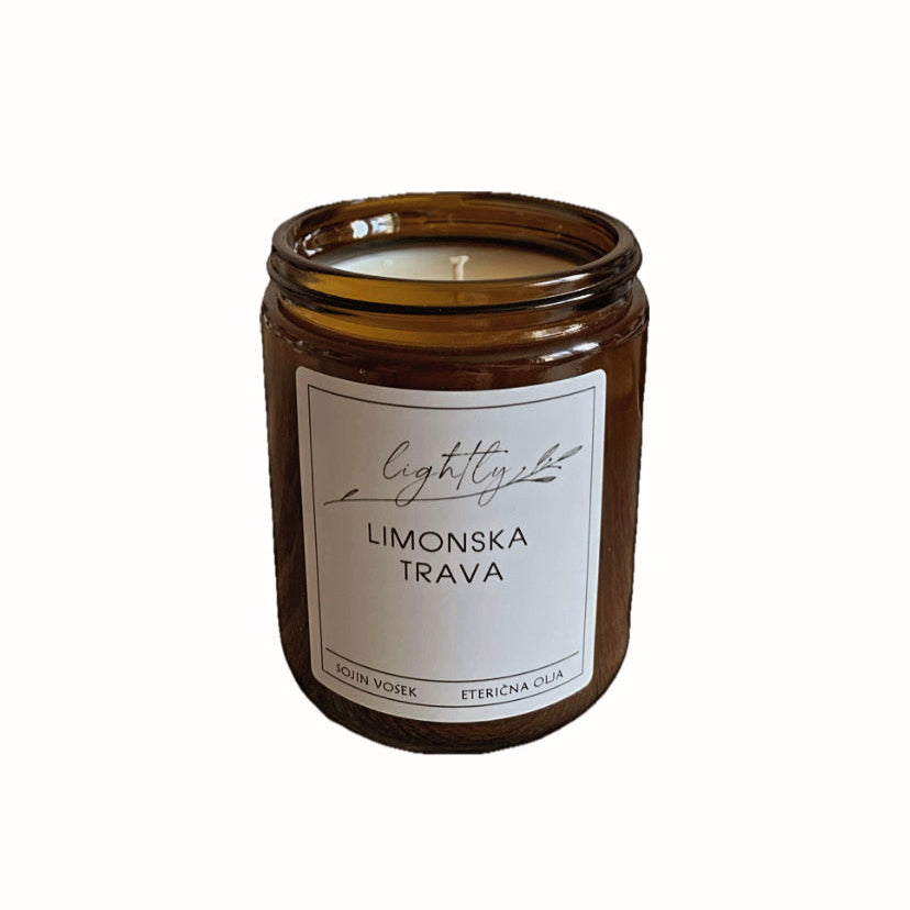 Ročno vlita sojina svečka v steklenem jantar kozarčku s pokrovčkom.